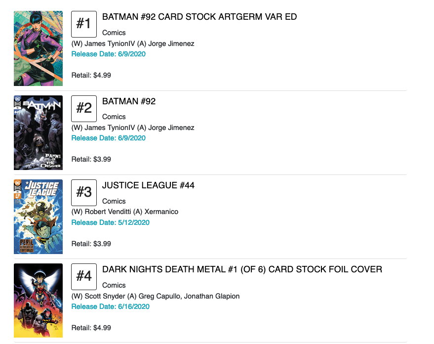 During June, UCS had a Best Sellers section on its website, including sections for comic books, graphic novels, magazines, books, and promotional items. They were simple top ten lists, without any indexed sales figures, and appeared to co-mingle both preordered items and those that had shipped. (For example, the June 1, 2020 snapshot, seen at left, included items that had not shipped yet.)