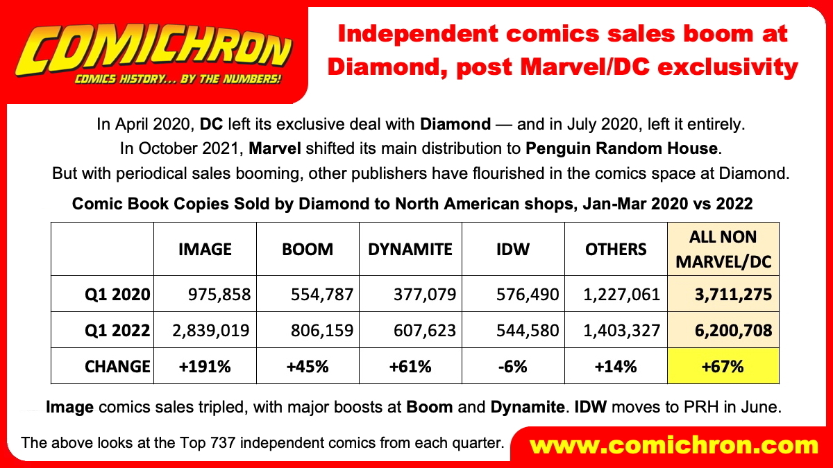 Diamond's February and March charts came out on the second anniversary of the first comic books that DC sold via Lunar Distribution, ending its exclusive with Diamond. The first quarter's sales of comic books for all publishers but Marvel at Diamond in 2022 were up a great deal over those same publishers' sales in the winter of 2020. That quarter saw 737 indie comics make the Diamond charts; the top 737 indie books in Q1 2022 sold a total of 67% more copies.