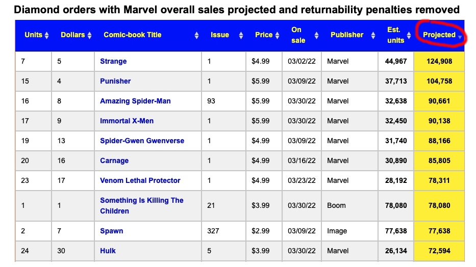 The "Projected" column in yellow restores that penalty to returnable issues in order to show the actual number that retailers ordered  — and it also projects the number of copies that Marvel sold overall, based on the percentage of Marvel's business that Diamond retained in October 2021 when Marvel moved its distribution business to Penguin Random House, which is estimated to be around 36%. To resort the chart to see where Marvel and returnable titles probably ranked, click on the arrow atop the "Projected" column. If you want to restore the original order, just click on the "Units" column. (Note that Something is Killing the Children #21 would rank second, as Diamond split the issue's sales into two different chart entries.)