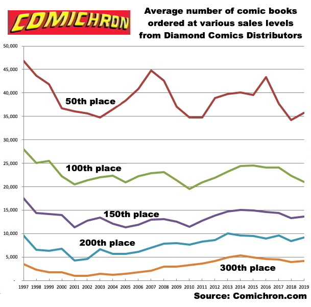 Whereas 300th place level on the Diamond sales chart has long provided a useful benchmark for sales, the availability of information below that level has been intermittent. After Diamond began reporting the Top 50 Independent and Top 50 Small Publisher titles, data on scattered titles in the 300s and occasionally 400s appeared; there was also a brief period in 2013-14 during which Diamond released the full Top 400. Most recently, Diamond switched to reporting the Top 500 in December 2017.