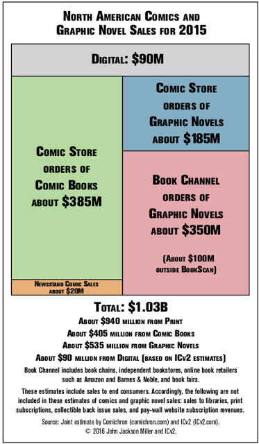 As presented above and in the accompanying infographic, the analysis by Comichron and ICv2 was divided up between periodical comics, graphic novels, and digital download-to-own sales. All print figures are calculated based on the full retail price of books sold into the market, and do not account for discounting or markup. Digital sales do not include subscription or "all you can read" services.