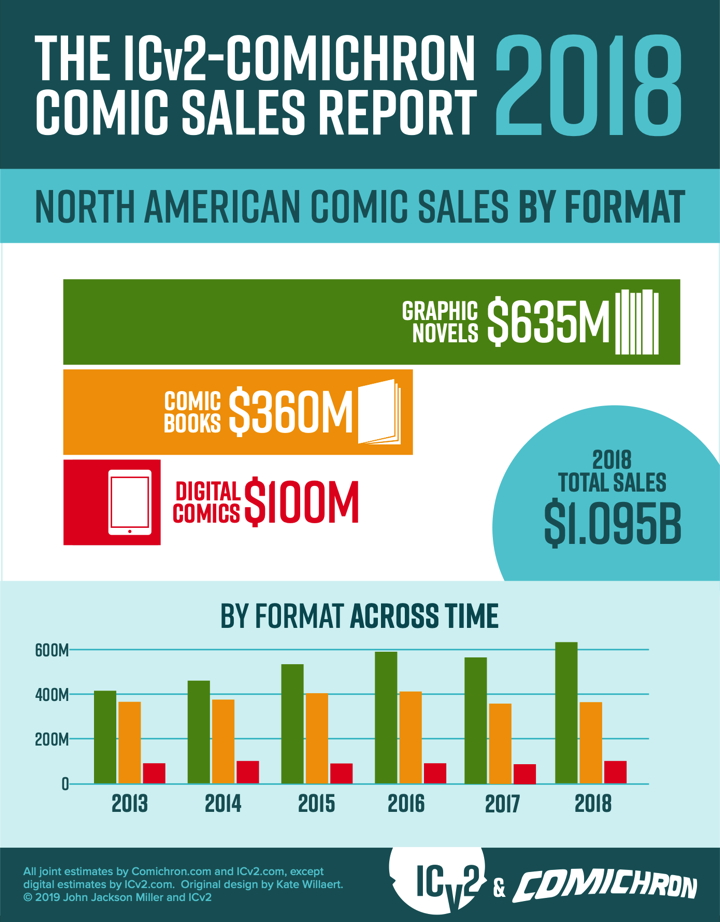 As presented above and in the accompanying infographics, the analysis by Comichron and ICv2 was divided up between periodical comics, graphic novels, and digital download-to-own sales. All print figures are calculated based on the full retail price of books sold into the market, and do not account for discounting or markup. Digital sales do not include subscription-based “all you can read” services.